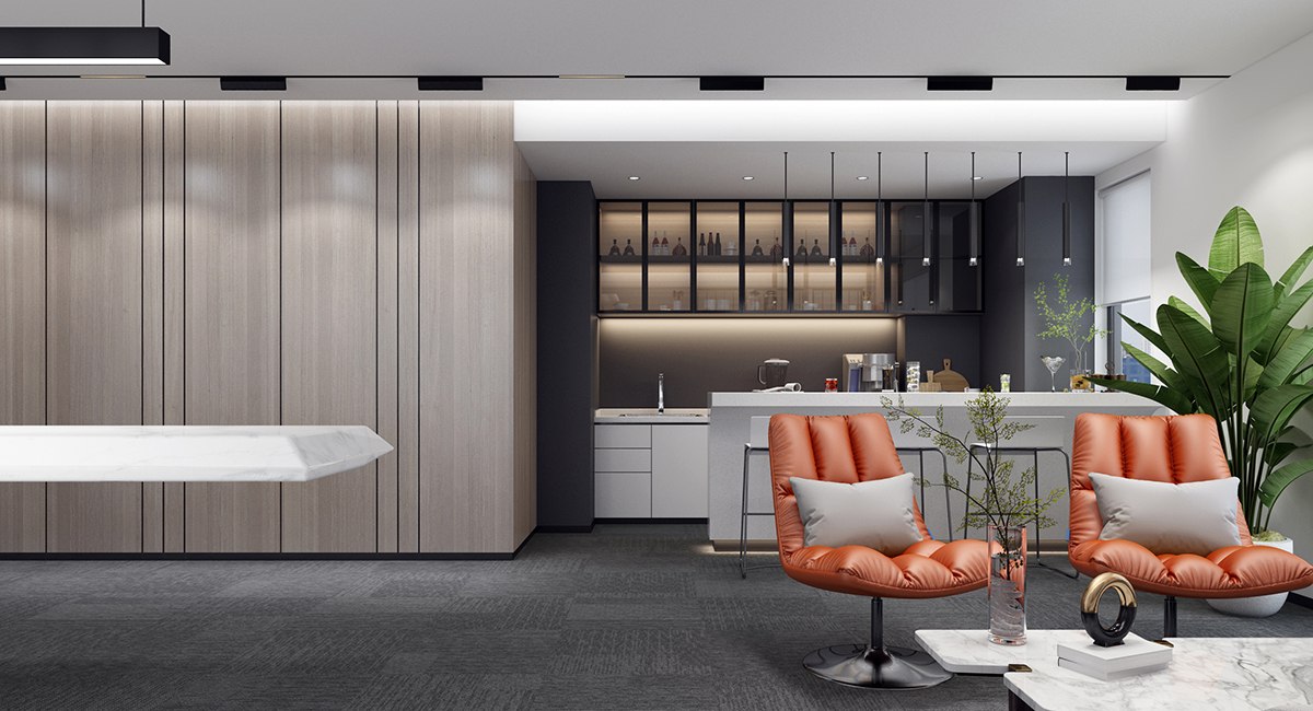 天然的材料(如吸音織物和木板/門)與嵌入在涂有聚氨酯涂料的面板連接槽中的硬線LED燈具很好地保持了平衡。即使在充滿張力的空間中,它也會(huì)通過(guò)在藝術(shù)品上添加一些有機(jī)特征來(lái)賦予其柔軟感。